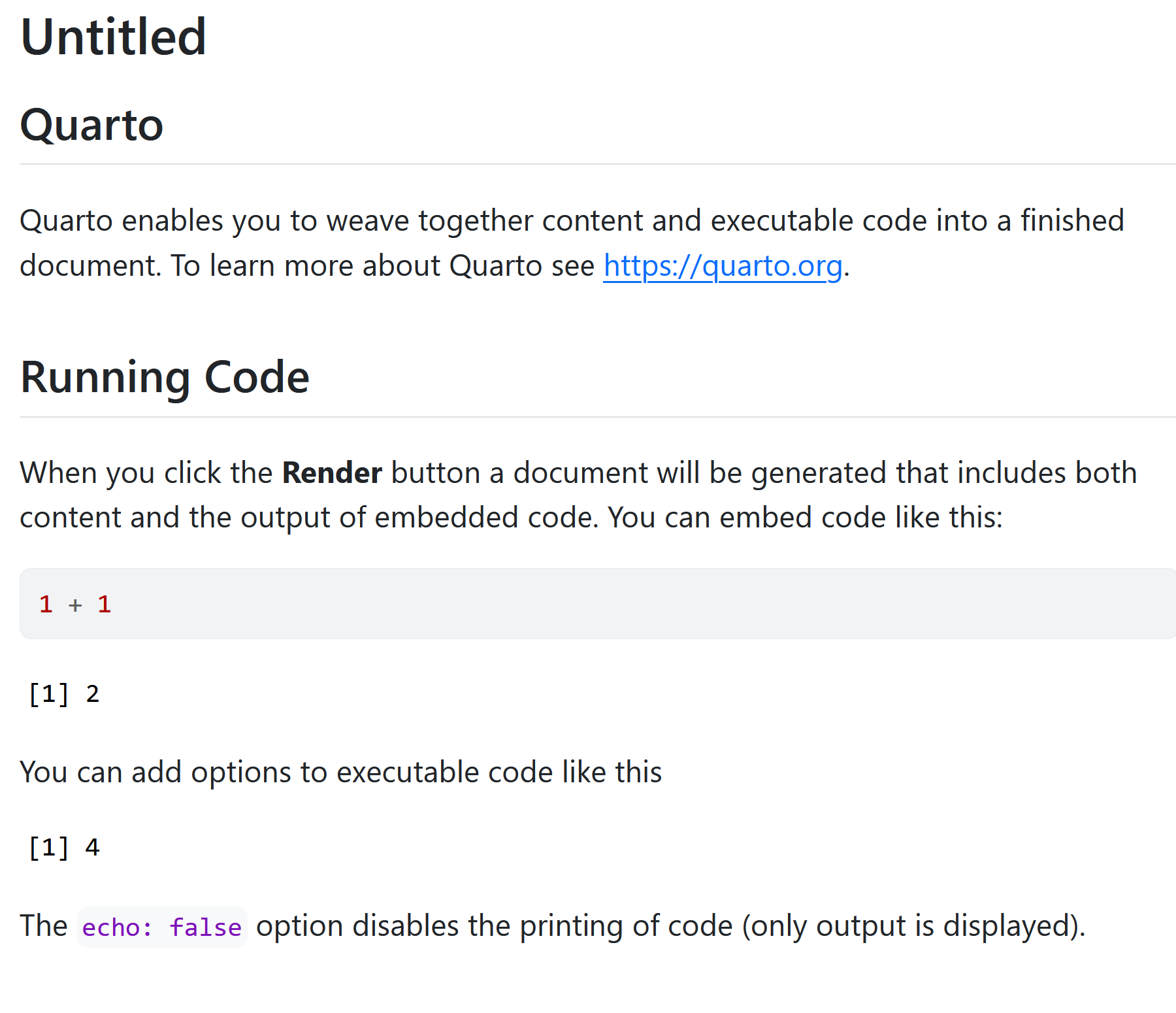 The newly created .qmd file comes with basic instructions, let us go through it now.