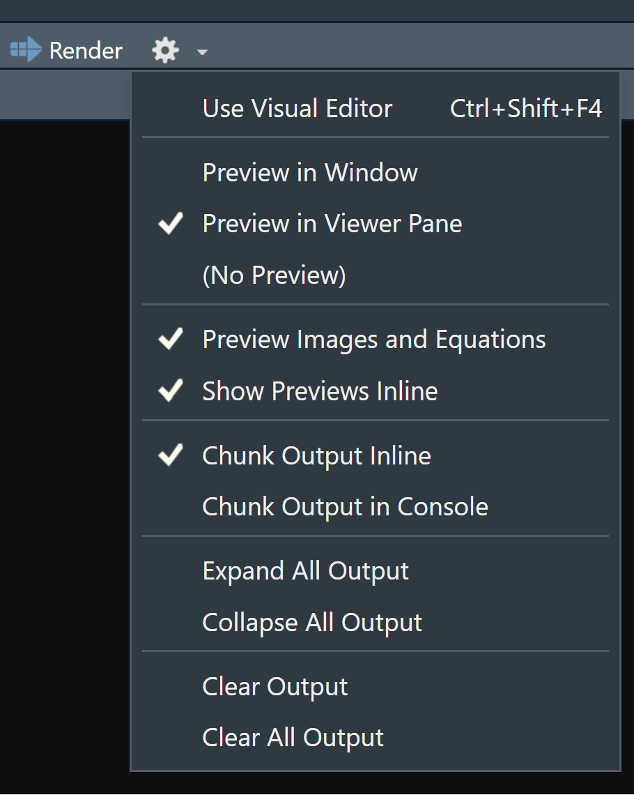 Read more about R Code Chunks at https://rmarkdown.rstudio.com/articles_intro.html. You can also change this from the gear icon on the right of the code chunk