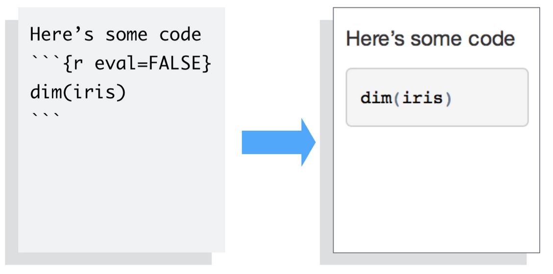 To omit the results from your final report (and not run the code) add the argument eval = FALSE inside the brackets and after r. This will place a copy of your code into the report.