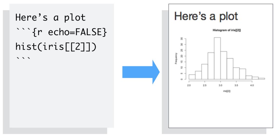 To omit the code from the final report (while including the results) add the argument echo = FALSE. This is very handy for adding plots to a report, since you usually do not want to see the code that generates the plot.